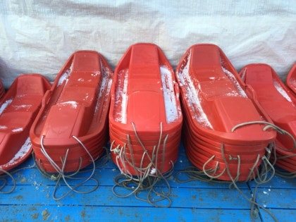 可以自行拿取塑膠雪橇,